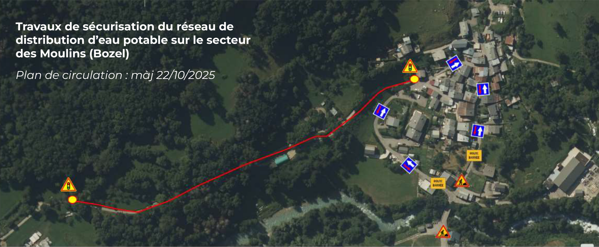 Depuis le 13 octobre 2025, des travaux de sécurisation du réseau de distribution d’eau potable vont démarrer sur le secteur des Moulins (Bozel) au niveau du pont. Ce hameau est actuellement alimenté par le réseau de Courchevel, via un petit réservoir vétuste, avec une quantité de stockage insuffisante et sans traitement bactériologique. Après les travaux, le secteur sera alimenté depuis les réservoirs de Bozel, offrant ainsi un grand volume de stockage (réserve incendie), un traitement ultraviolet et de multiples ressources en eau disponibles. L’alimentation en eau actuelle depuis Courchevel sera conservée et pourra servir en secours.