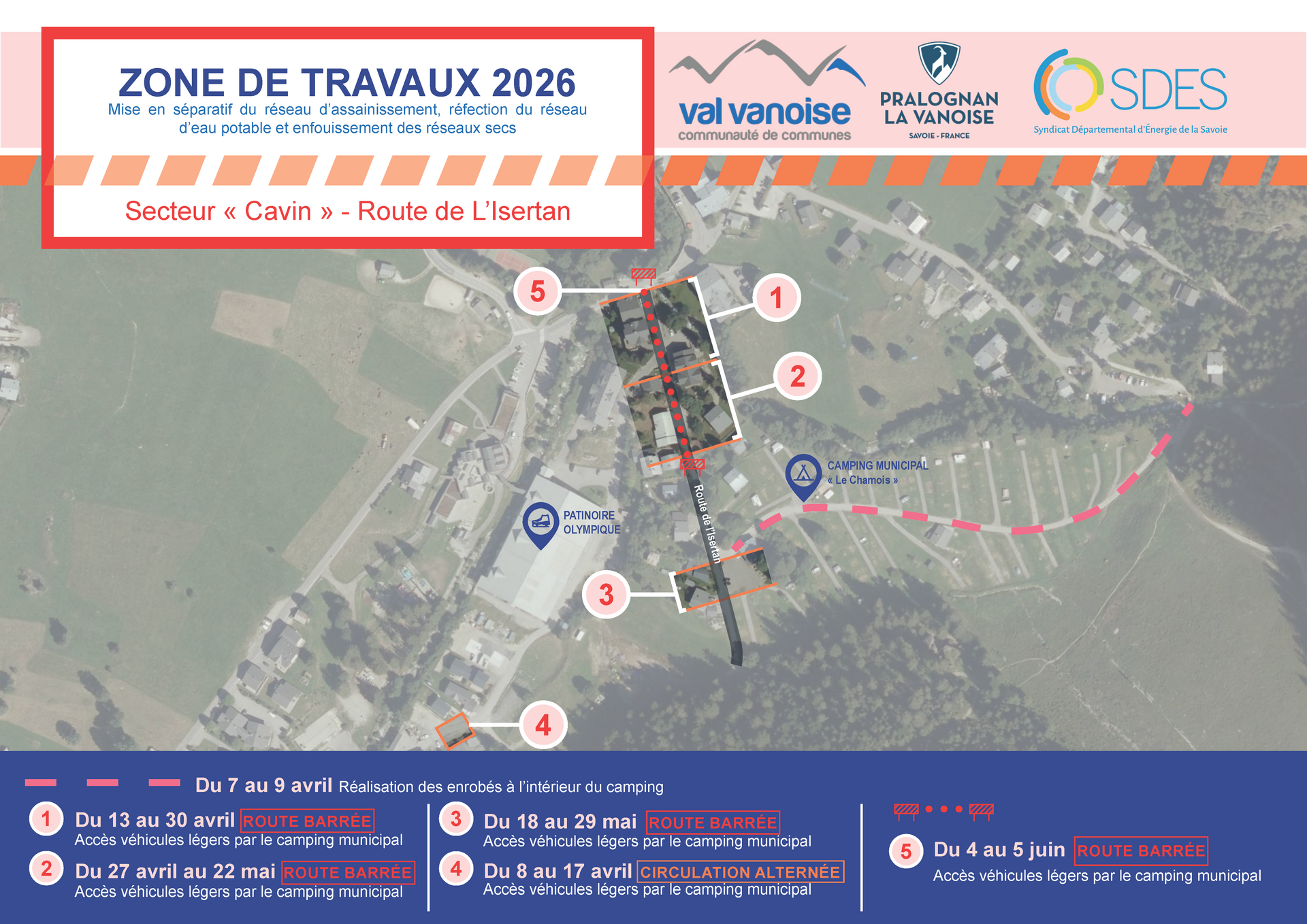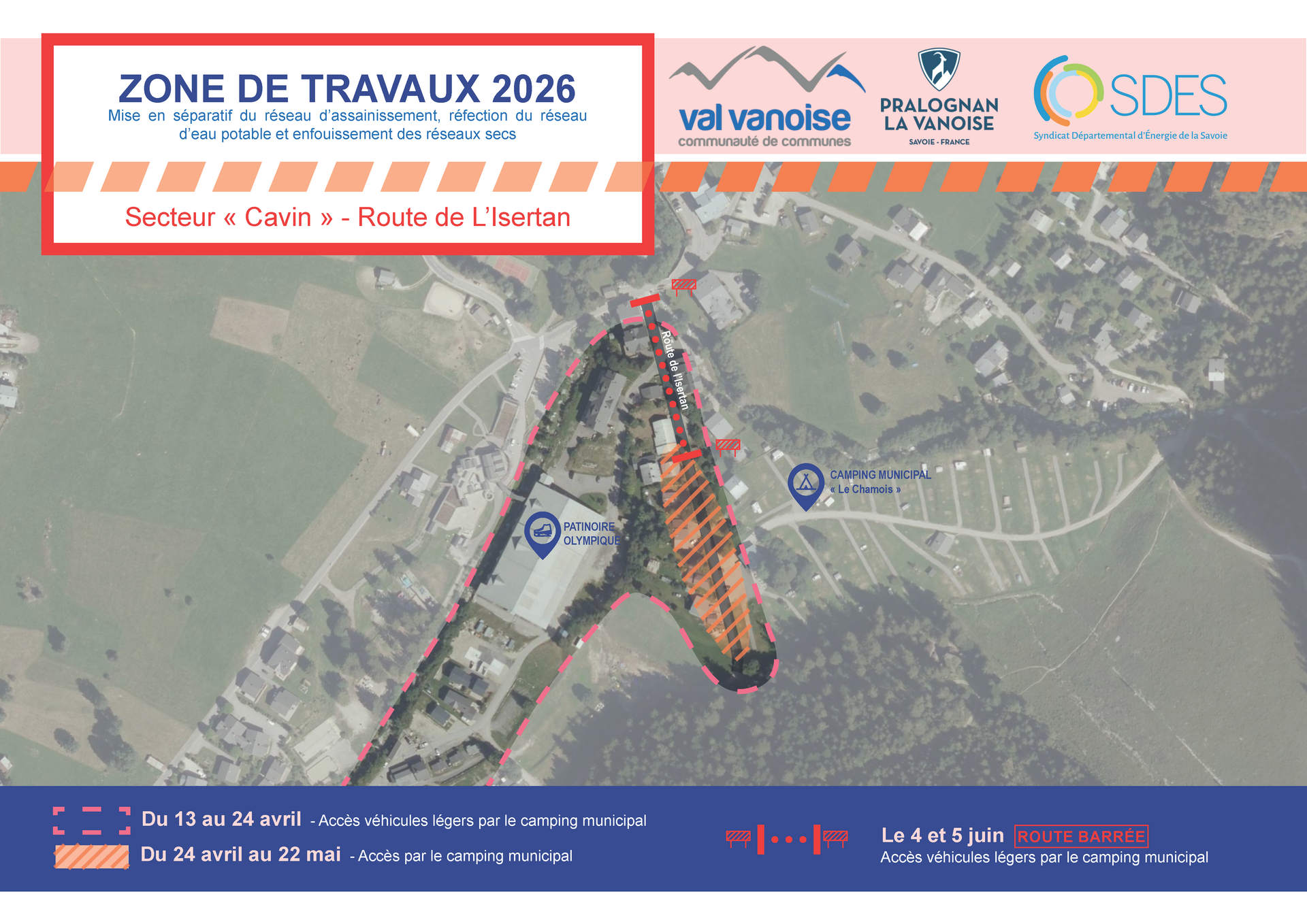 Le projet de renouvellement des réseaux autour de la route de l’Isertan entre dans une phase clé. Avec un investissement total de 1,9 M€ (dont 1,1 M € financés par Val Vanoise), le chantier se concentrera au printemps (voir plan de circulation ci-dessous) et à l'automne 2026 sur le secteur du camping municipal (reprise des enrobés) et de la route de l’Isertan (réseaux). L'objectif est double : garantir une distribution d’eau optimale en limitant les pertes et optimiser les coûts de traitement de la station d’épuration grâce à une meilleure séparation des eaux usées et eaux pluviales. Un plan de circulation spécifique pour les riverains est consultable sur le site internet de la collectivité.